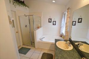 has separate tub and walk in shower, fully tiled with separate toilet.