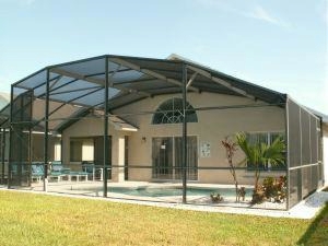 pool enclosure extends across all the rear of the home and has a large